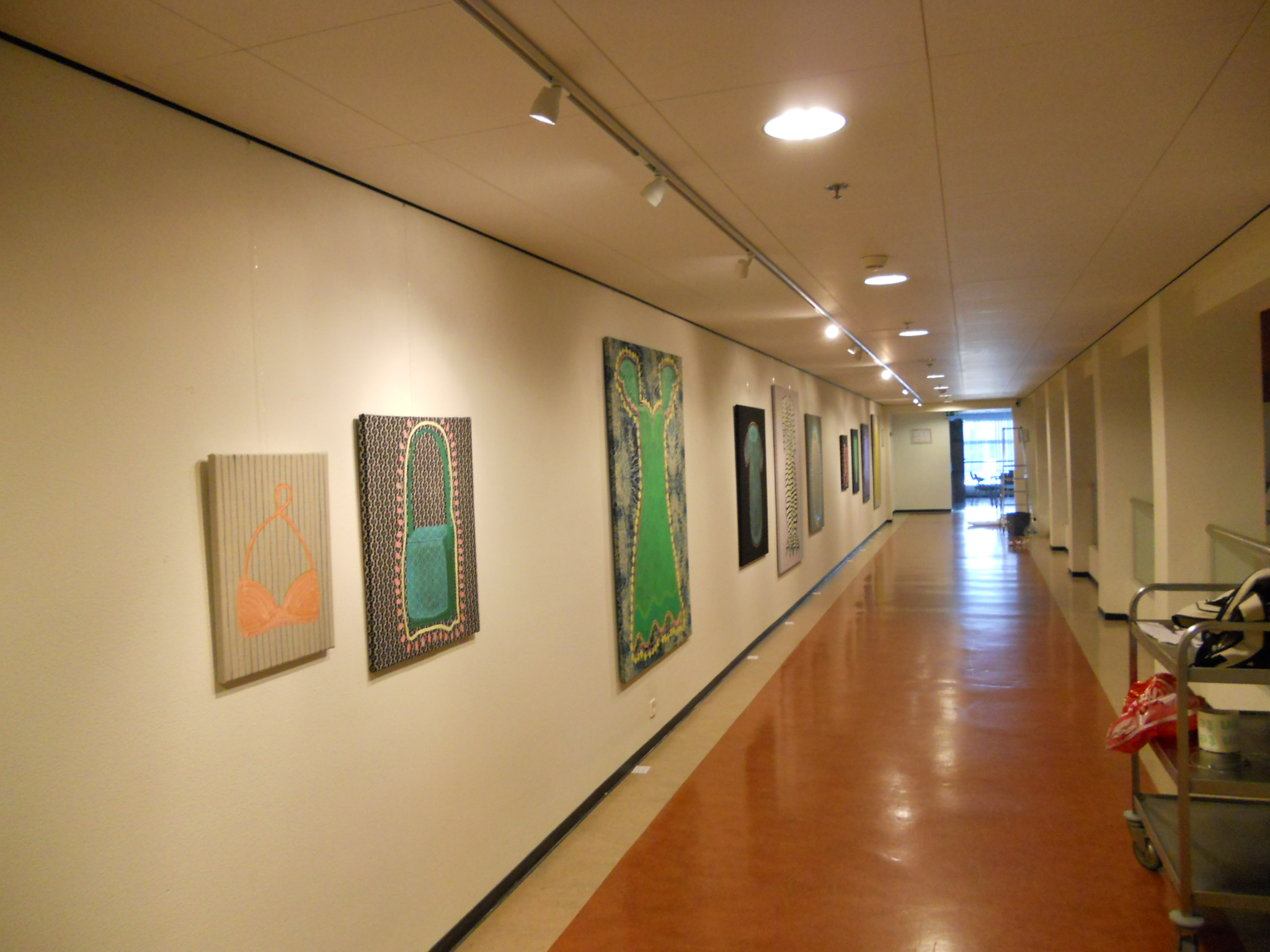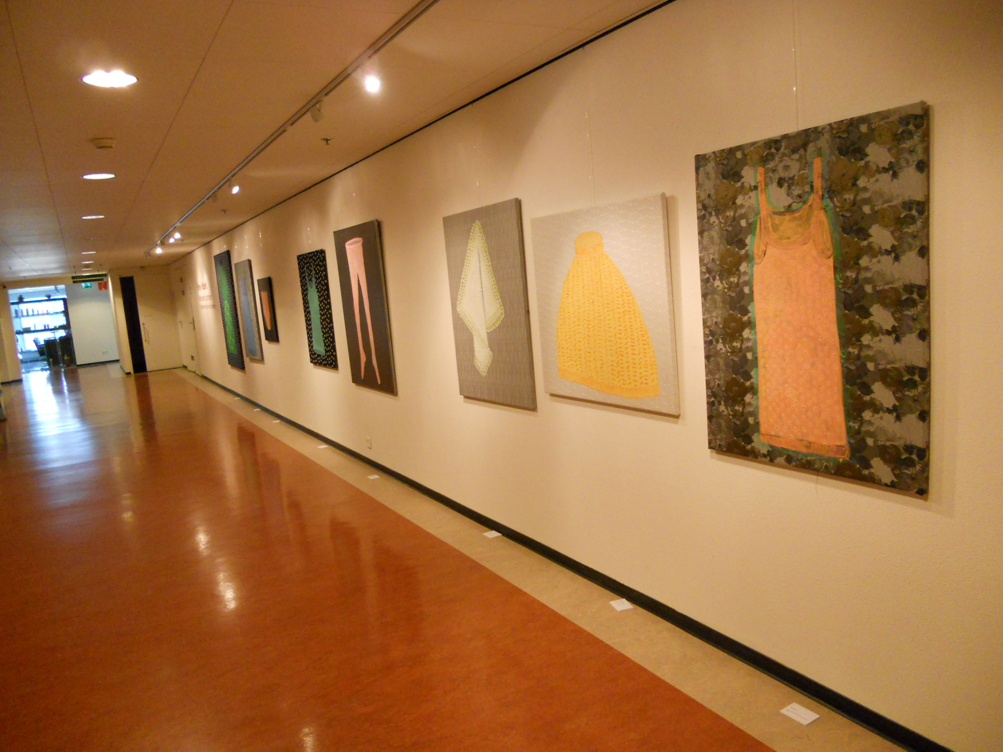In 2012 schilderde ik nog. In Het Atrium medisch centrum in Heerlen heb ik in der tijd mijn schilderijen kunnen tonen. Repetitieve patronen op bedrukt textiel vormde een uitgepakte kledingkast op de muren van het Atrium. De kleuren wervelde rond het kledingstuk alsof het te drogen hing aan een wasdraad in de wind. Geschilderde lichtreflecties gaven de doeken adem en hartslag.