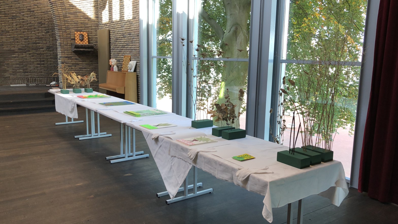 On Location / Kapel broederschool, Heerlen. 7 oktober 2018. Opstelling voor het bekijken van mijn schilderwerk. Inkt op papier, series 1 t/m 7. Met handschoentjes aan mocht het publiek zelf bladeren door de series die op een tafel gepresenteerd werden. Samen met Marieke Coppens en Yvon Drummen.